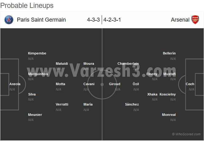 ونگر و شاگردانش در دو بازی اخیرشان به پیروزی رسیده اند، با روحیه ای خوب به پاریس سفر خواهند کرد. آرسنال نیز شروع خوبی در لیگ نداشت ولی در دو بازی اخیرش موفق شد دو پیروزی کسب کند و وضعیت خود را کمی بهبود ببخشد. آخرین تقابل دو تیم به فصل 94-93 و نیمه نهایی جام برندگان باز میگردد. آرسنال در مجموع موفق شد 2-1 حریف را شکست دهد و به فینال صعود کند. در 39 بازی اخیر خانگی در رقابتهای اروپایی، پاری سن ژرمن تنها 1 بار شکست خورده که به دیدار مقابل بارسا باز میگردد و در دیگر بازیها، 25 برد و 13 تساوی به دست آورده است. آرسنال نیز در 12 بازی اخیرش در فرانسه شکست ناپذیر بوده، 8 پیروزی و 4 تساوی کسب کرده و 7 بازی اخیرش با پیروزی به پایان رسیده است. آرون رمزی، گابریل پائولیستا، کارل ینکینسون، دنی ولبک و مرته ساکر غایبین آرسنال خواهند بود و در سوی دیگر حضور تیاگو سیلوا، خاویر پاستوره،مکسول،آئوریر و کورزاوا در هاله ای از ابهام قرار دارد.