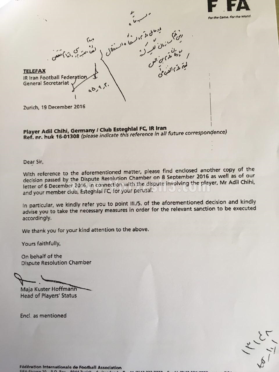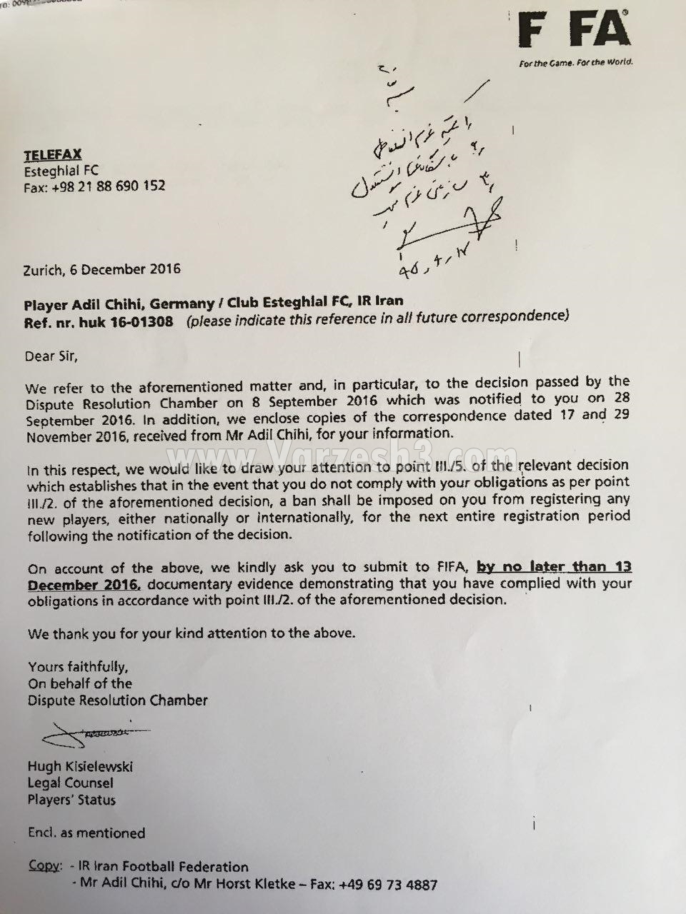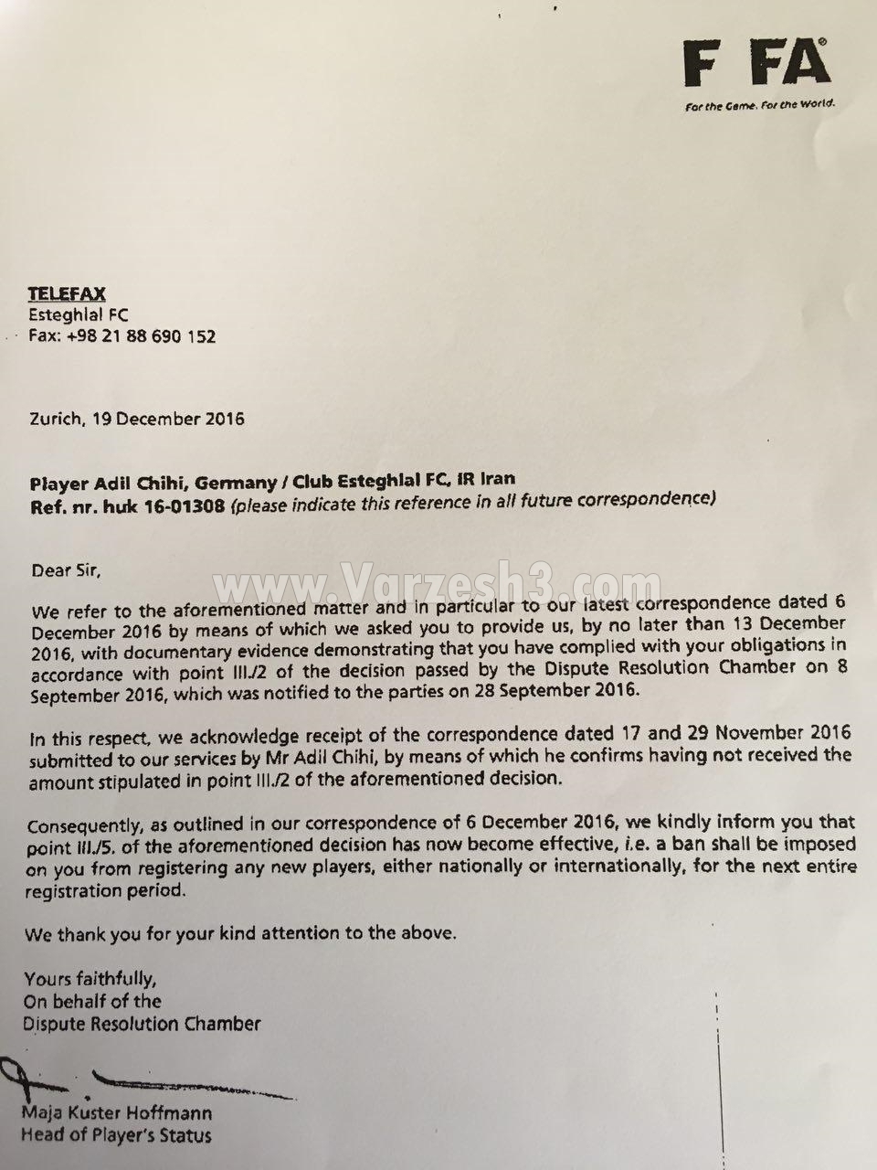 اما کلیدی ترین نامه در این ماجرا توسط فیفا به باشگاه استقلال فکس شده است. روال فیفا این است که اگر باشگاهی در ابتدای مکاتباتش با این مرجع از طریق فدراسیون کشورش اقدام کند نامه ها ابتدا به فدراسیون فکس می شود و رونوشتش به باشگاه ارسال می شود اما اگر باشگاه خود مستقیم مکاتبه کند نامه ها قبل از فدراسیون برای خود باشگاه ها فکس می شود که استقلال این راه را انتخاب کرده بود.از همین رو نامه اصلی و کلیدی در محرومیت از نقل و انتقالات 19 دسامبر برای خود استقلال فکس شد و محرومیت رسما ابلاغ شد چون پولی به عادل شیحی پرداخت نشده بود. (نامه شماره 5)