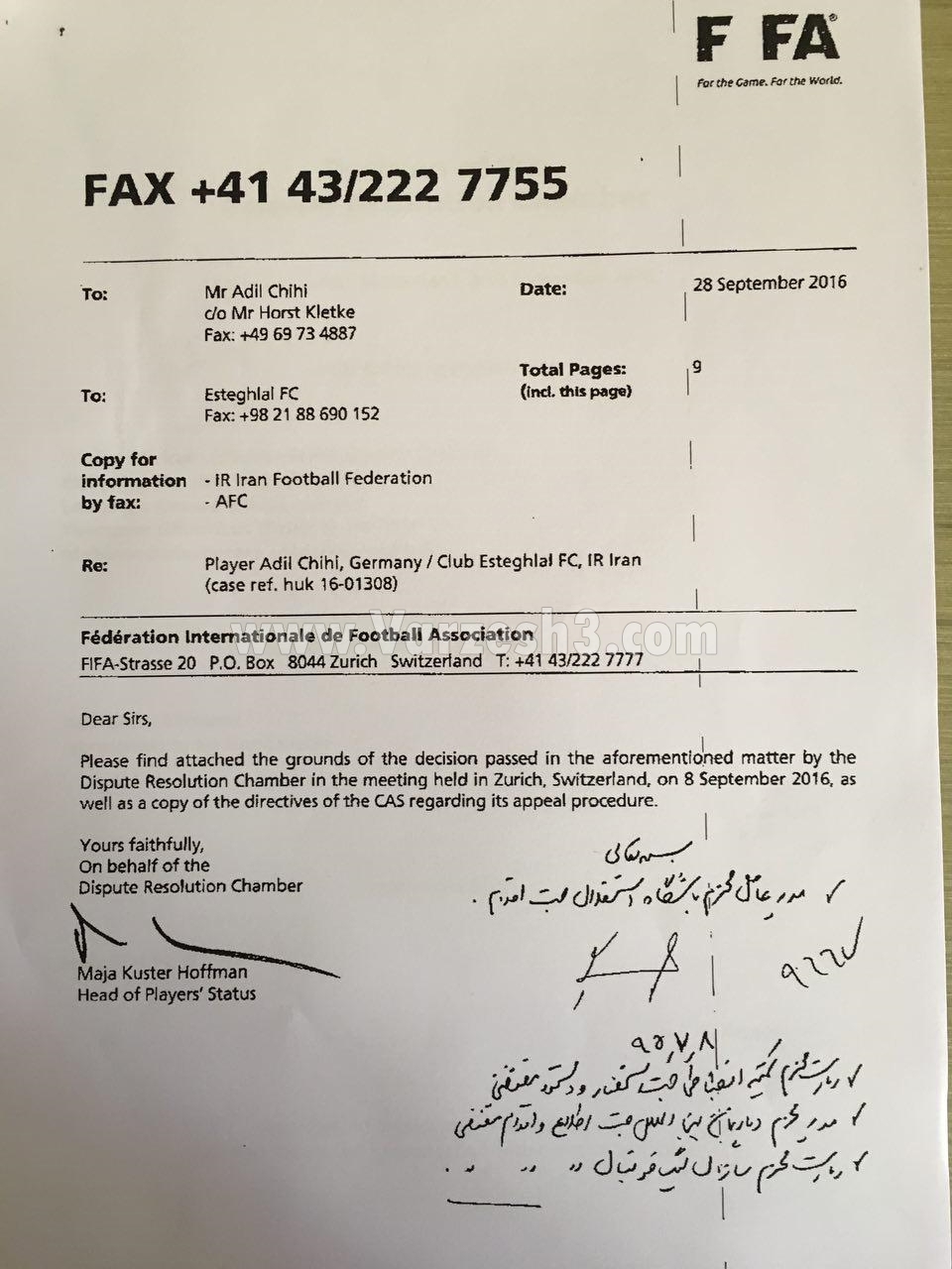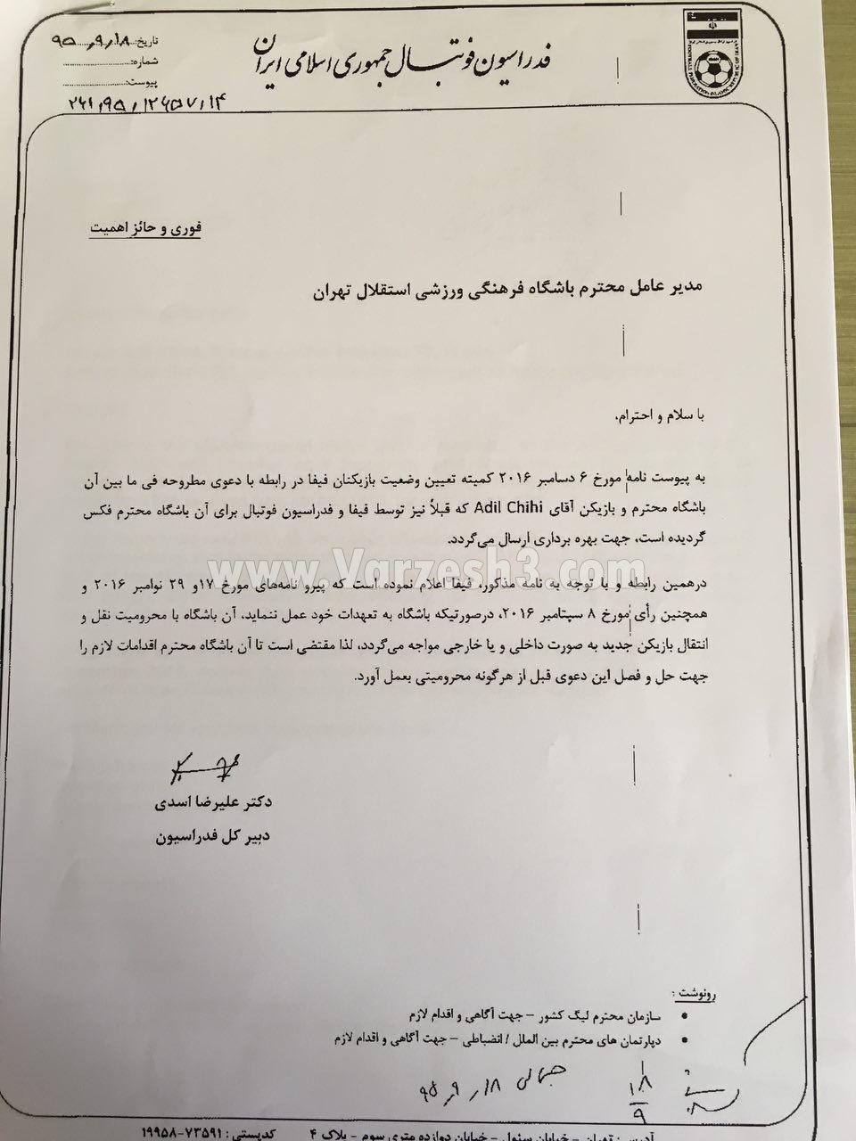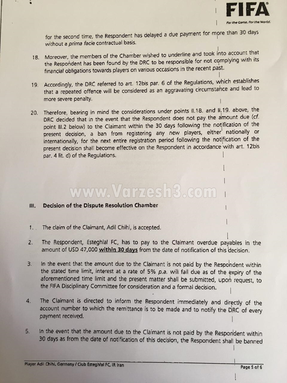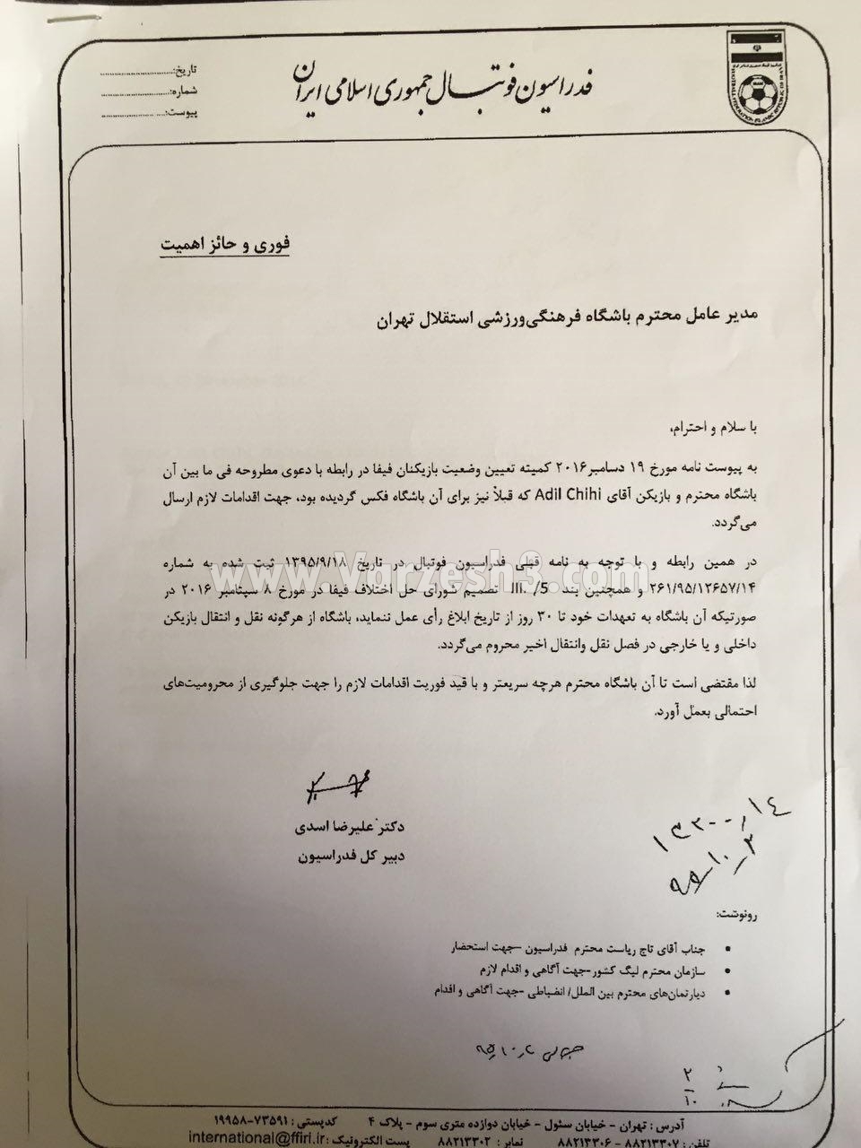 اما کلیدی ترین نامه در این ماجرا توسط فیفا به باشگاه استقلال فکس شده است. روال فیفا این است که اگر باشگاهی در ابتدای مکاتباتش با این مرجع از طریق فدراسیون کشورش اقدام کند نامه ها ابتدا به فدراسیون فکس می شود و رونوشتش به باشگاه ارسال می شود اما اگر باشگاه خود مستقیم مکاتبه کند نامه ها قبل از فدراسیون برای خود باشگاه ها فکس می شود که استقلال این راه را انتخاب کرده بود.از همین رو نامه اصلی و کلیدی در محرومیت از نقل و انتقالات 19 دسامبر برای خود استقلال فکس شد و محرومیت رسما ابلاغ شد چون پولی به عادل شیحی پرداخت نشده بود. (نامه شماره 5)