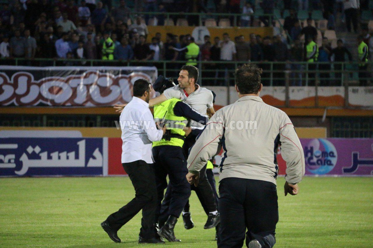 گفتنی است تصویر زیر یکی از طرفداران صبا است که پس از سوت پایان مسابقه قصد حمله به داور را داشت که البته توسط نیروهای امنیتی مهار شد.