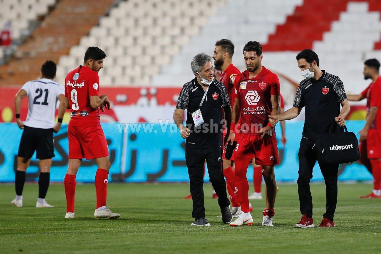 21:32 - در زمان استراحت بین دو نیمه، شجاع خلیل زاده همچنان مشغول مداوا است.