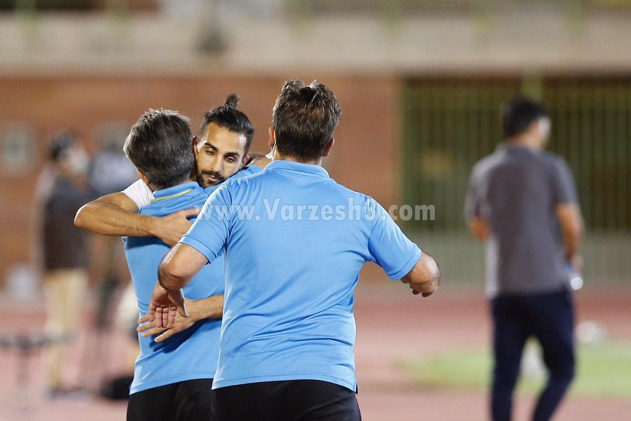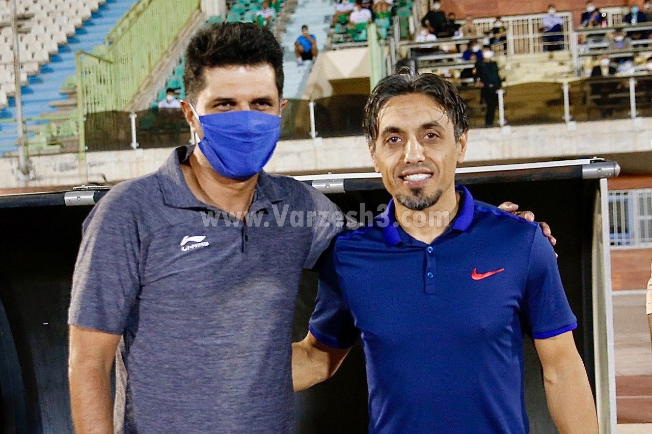 * سید مجتبی حسینی و رسول خطیبی، سرمربیان دو تیم قبل از شروع مسابقه برخورد گرمی با یکدیگر داشتند.