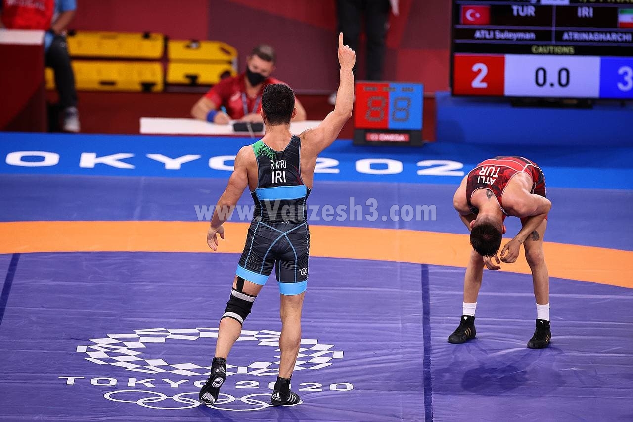 7:46: رضا اطری در گام نخست وزن 57 کیلوگرم کشتی آزاد در یک مبارزه حساس و نفسگیر سلیمان آتلی کشتیگیر ترکیهای را با نتیجه 3 بر 2 شکست داد و راهی مرحله یک چهارم نهایی شد.