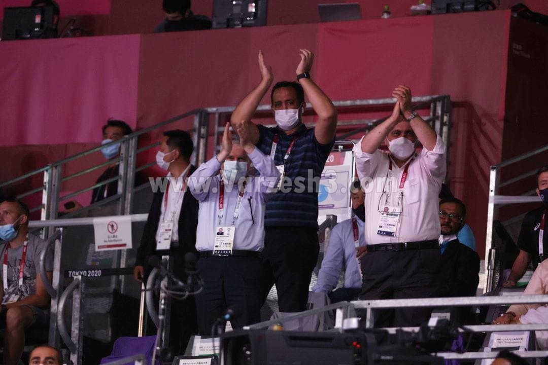 ۱۵:۰۸ - خوشحالی صالحی امیری رییس کمیته ملی المپیک و فخری مدیر کاروان ایران پس از صعود یزدانی به فینال کشتی.