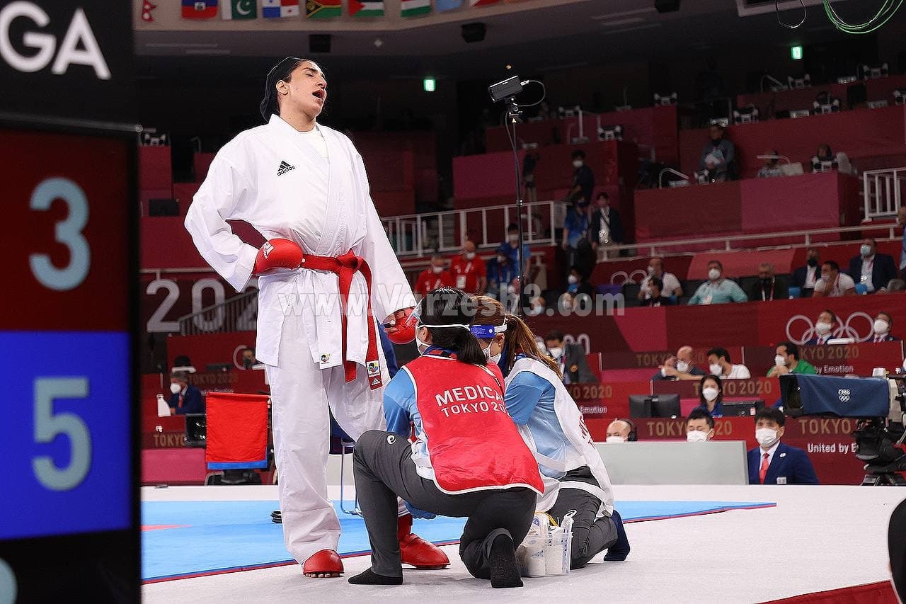 کاراته کا ایران در طول مسابقه چندین بار پس از مصدومیت توسط پزشکان تحت مداوا قرار گرفت. آنها با بستن قسمت آسیب دیده زانو و اسپری عباسعلی را مهیای ادامه مسابقه می کردند.