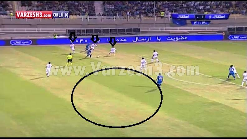 حرکت در عرض بازیکنان استقلال خوزستان در دقیقه 83 بازی با پاس خوب به مرکز زمین همراه می شود. در این صحنه فضای مشخص شده در جلوی خط دفاعی استقلال اتفاقی است که در دقایق ابتدایی نیمه دوم نیز خوزستانی ها به استفاده از آن اصرار داشتند.