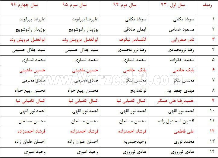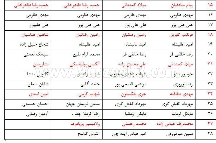 *بیرانوند، رادوشویچ، درویش وند، جلال حسینی، خلیل زاده، انصاری، ماهینی، صادق محرمی، شایان مصلح، محسن ربیع خواه، احمد نور اللهی، کامیابی نیا، سیامک نعمتی، محسن مسلمان، فرشاد احمدزاده، احسان علوان زاده، وحید امیری، بشار رسن، حمیدرضا طاهرخانی، مهدی طارمی(؟؟)، گادوین منشا، علی علیپور.