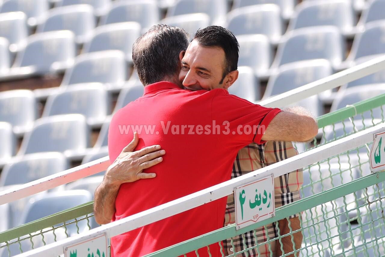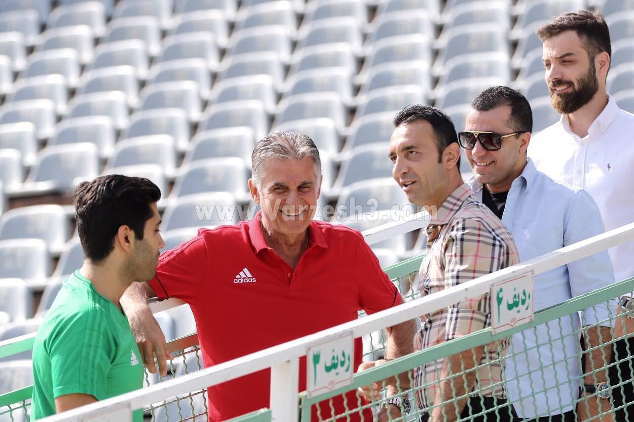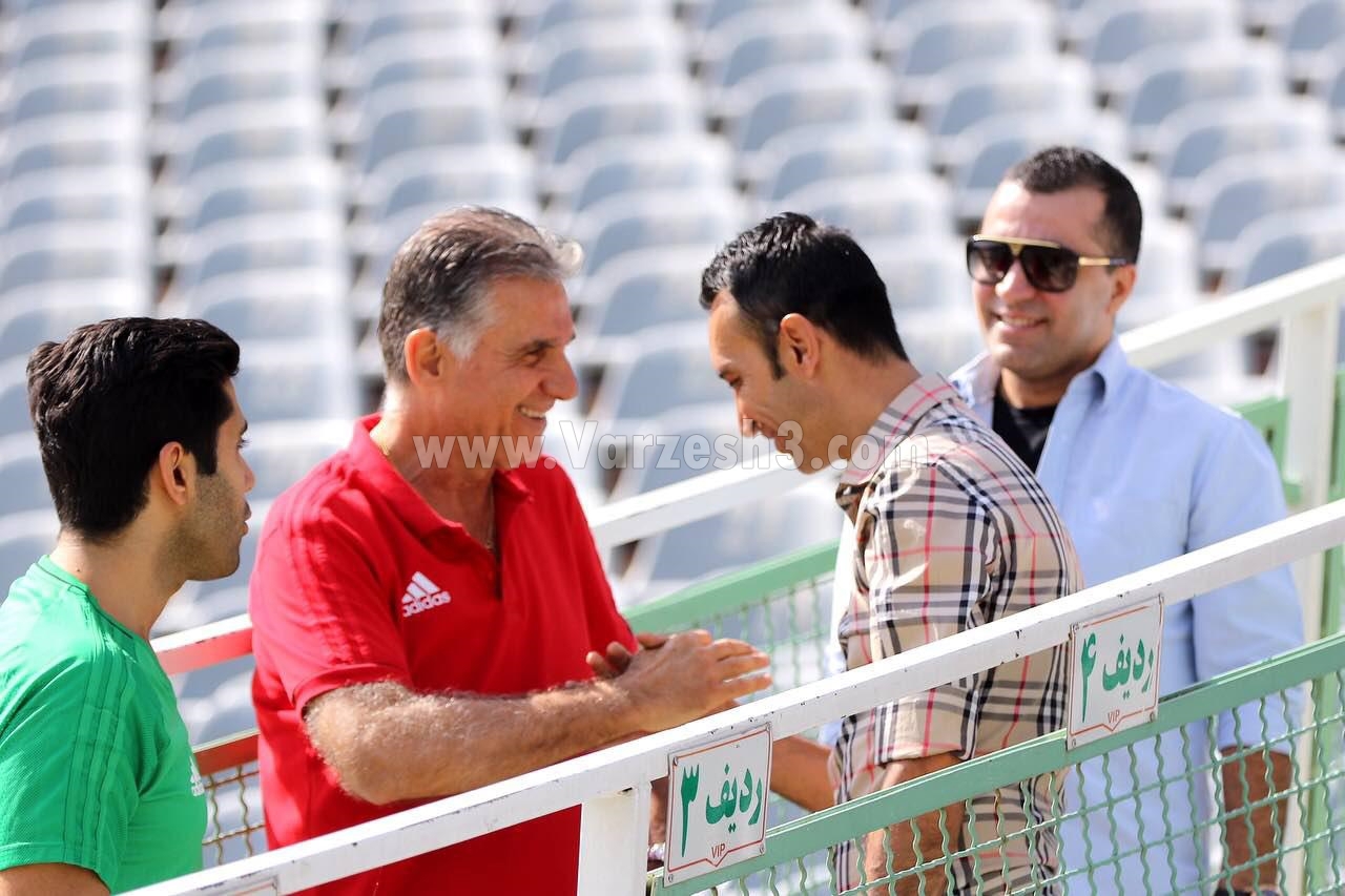 سرمربی تیم ملی که در حال رفتن به سمت جایگاه ویژه بود تا تمرین را از زاویه دیگری تماشا کند که با عنایتی رو به رو شد و لحظاتی با او گفت و گو کرد و با یک لبخند به سرشناس ترین مهمان تمرین خوش آمد گفت.