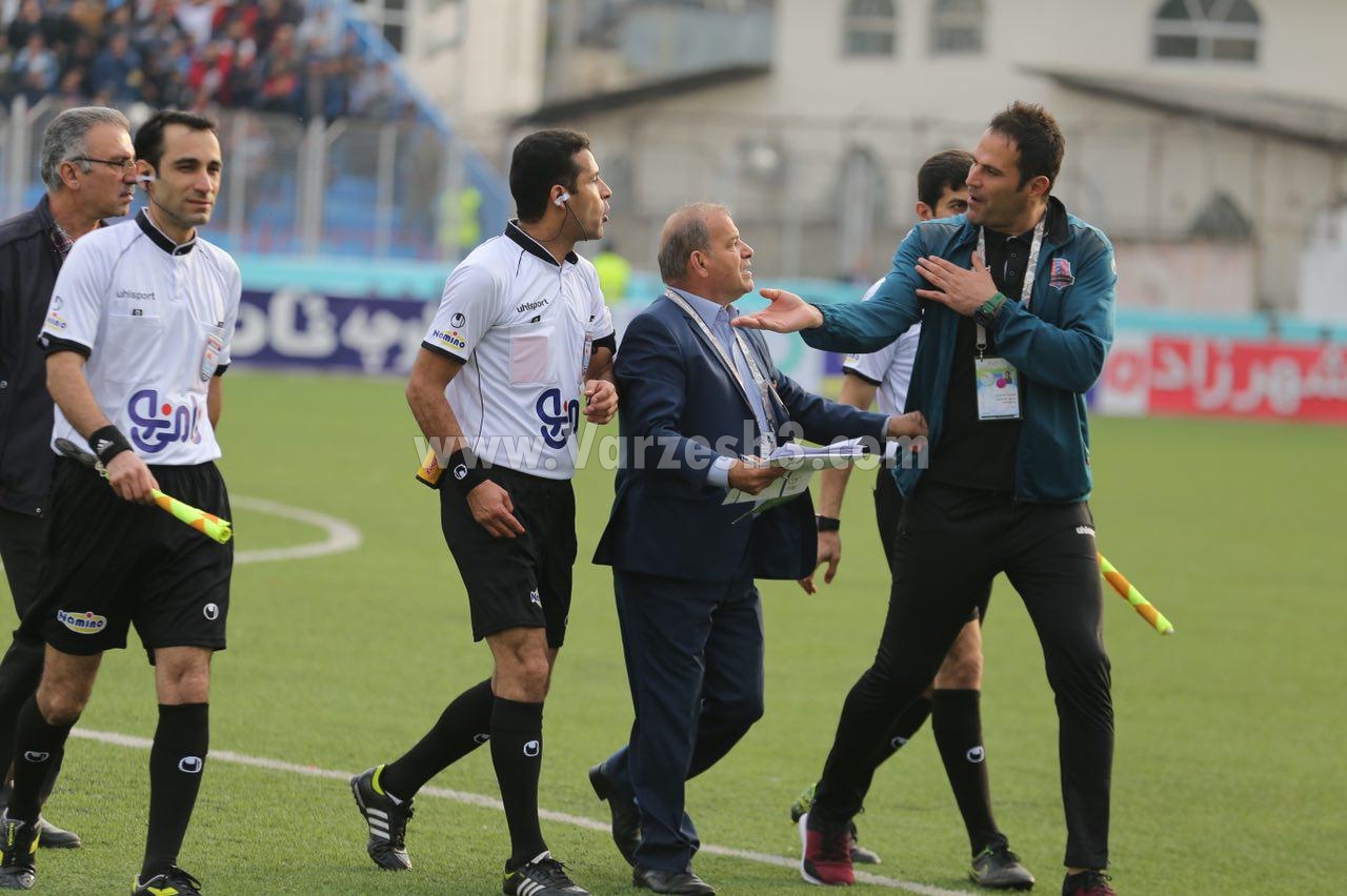 * سالاریفرد، مدیر تیم استقلال خوزستان در کنار زمین مدام با پورهادی، مسؤول برگزاری مسابقه در حال بحث است.