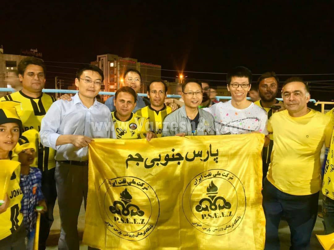 از آنجایی که پارس جنوبی متعلق به منطقه ویژه اقتصادی پارس است و مهندسان چینی زیادی برای انجام بیزنسهای گوناگون به عسلویه سفر میکنند، برخی از این افراد تصمیم گرفته اند اوقات فراغت خود را به تماشای فوتبال بپردازند. به همین خاطر روز گذشته در جریان بازی پارس جنوبی و سپاهان 4 نفر از چینیهای مقیم عسلویه در ورزشگاه تختی شهرستان جم حضور یافتند و به تشویق پارس جنوبی پرداختند.