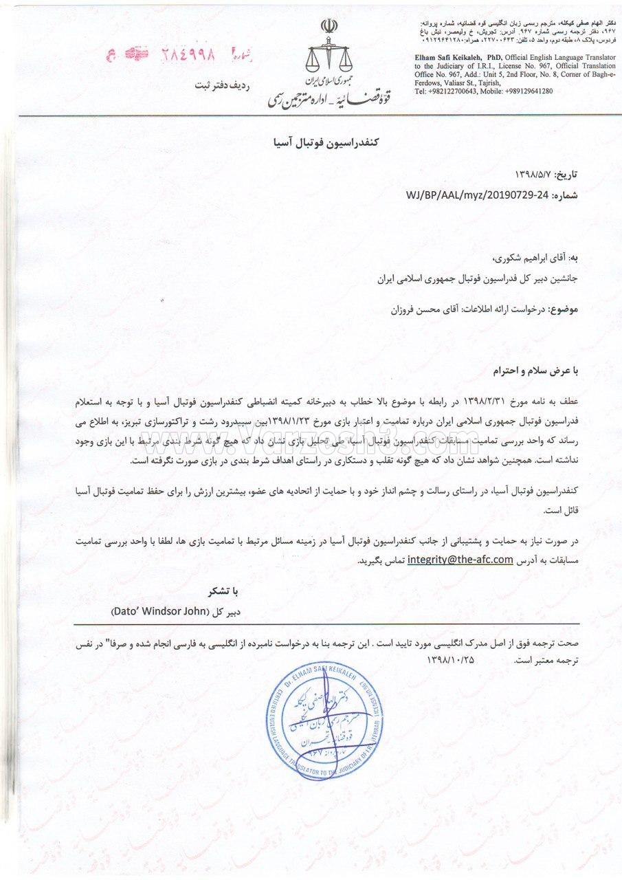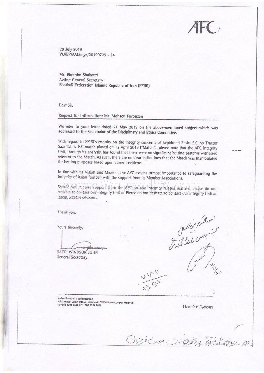 فدراسیون فوتبال در نامه و درخواست مفصل موضوع را به کنفدراسیون فوتبال آسیا ارجاع داده و از آنها درخواست بررسی و رسیدگی کرد. پس از تعیین کارگروه ویژه رسیدگی و بررسیهای به عمل آمده توسط کمیته صیانت AFC حکمی مبنی بر بیگناهی من صادر و صراحتاً اعلام کردند که هیچگونه شرطبندی مرتبط با این موضوع وجود نداشته و همه این اتهامات کذب محض است که حکم آن موجود است.