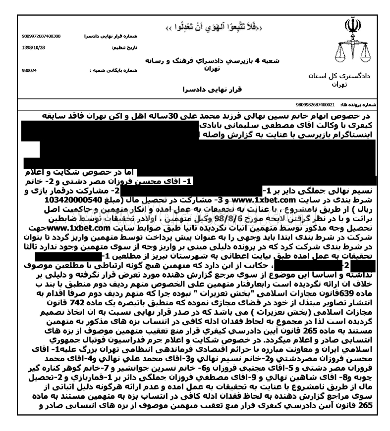اتهامی که علیه این افراد وجود داشت، کسب مال از راه نامشروع و شرطبندی در وبسایتهای خارجی بود؛ در این بین تحقیقات قوه قضاییه به شهادت افراد، بازرسی حساب فروزان، همسرش، خانواده و اقوامشان منتهی شد، اما هیچ دلیلی برای صدور حکم بر علیه این افراد، پیدا نشد تا اتهام آنها اثبات نشود.