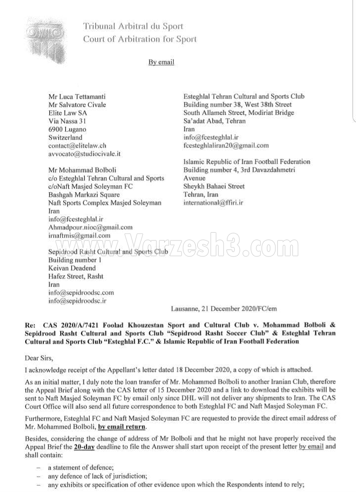 نکته مهم این است که باشگاه استقلال و فدراسیون فوتبال در دادگاه عالی ورزش دفاعیات خود را ارائه نکرده اند و همین موضوع سبب شده تا CAS با ارسال یک نامه به طرفین اعلام کند که اگر دفاعی انجام شود، طبق مستندات فولاد رای صادر میشود.