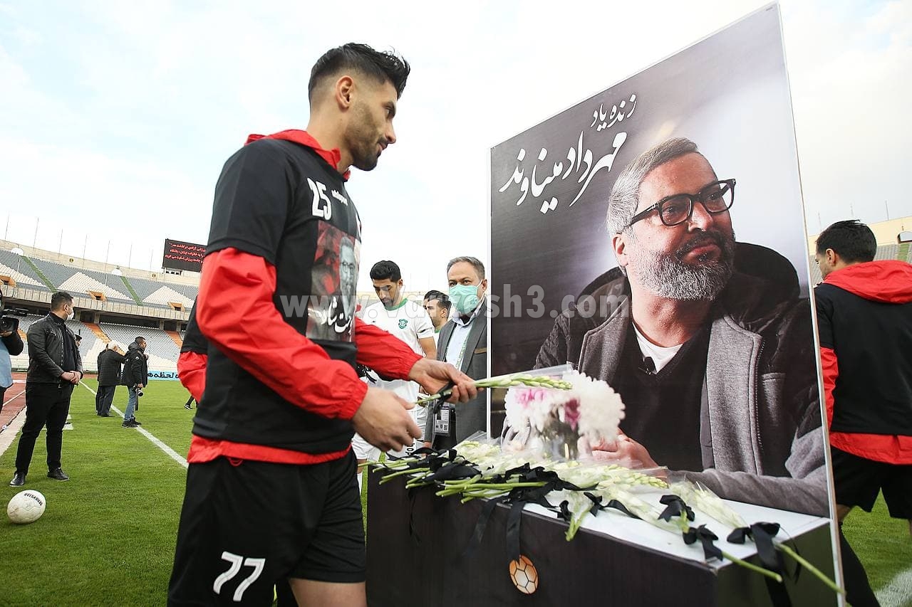 بازیکنان پرسپولیس امروز در شرایطی در استادیوم آزادی حاضر شدند که کانون هواداران این باشگاه برای یادبود مهرداد میناوند، روی سکوها طرح موزاییکی نام وی را طرح زده بودند.