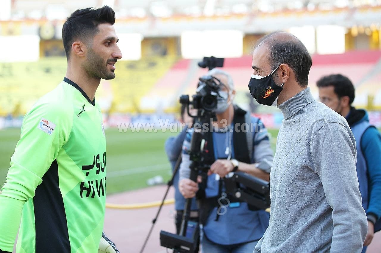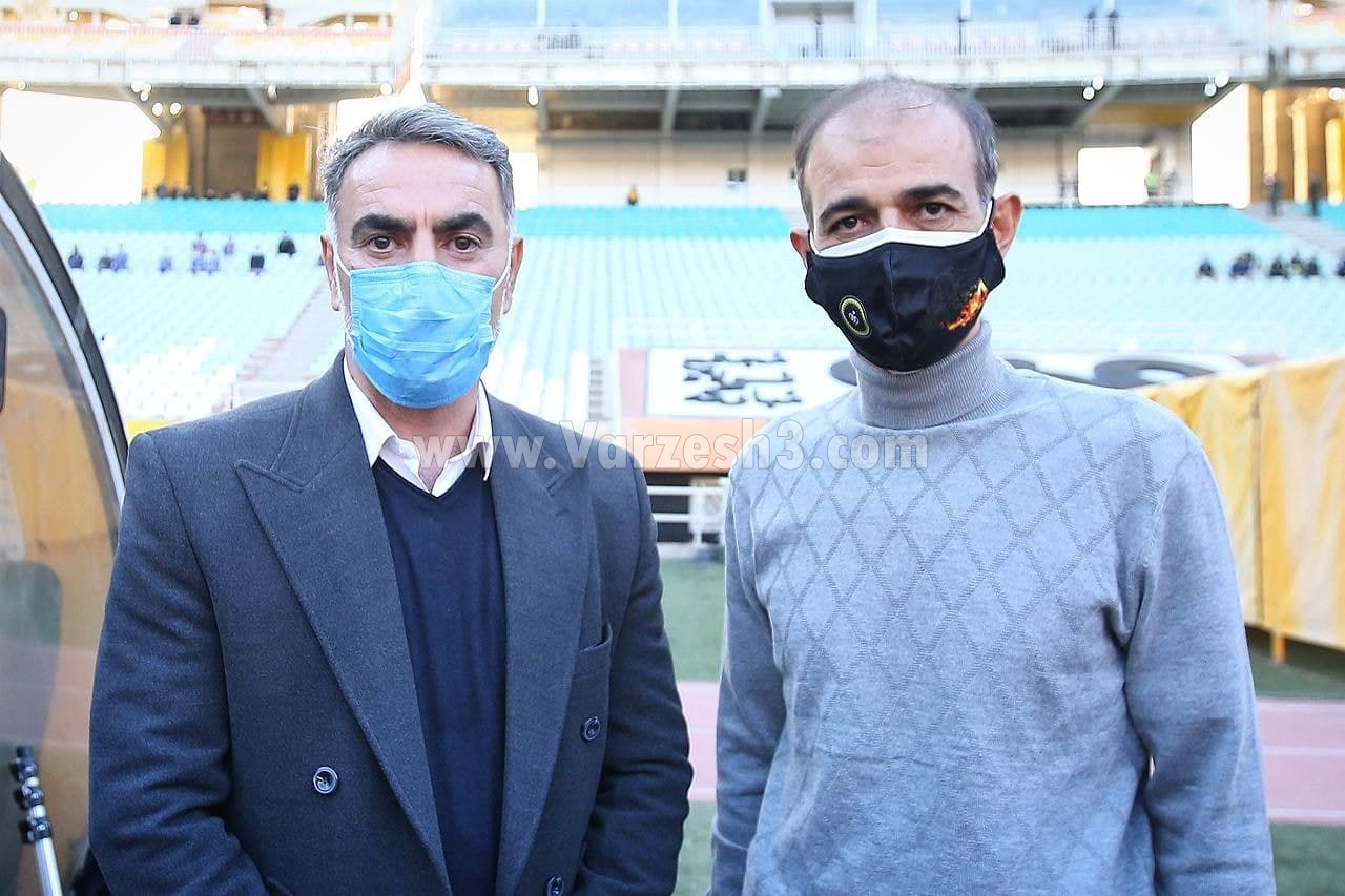 * پیش از شروع بازی محرم نویدکیا و محمود فکری، سرمربیان دو تیم با یکدیگر به خوش و بش پرداختند.