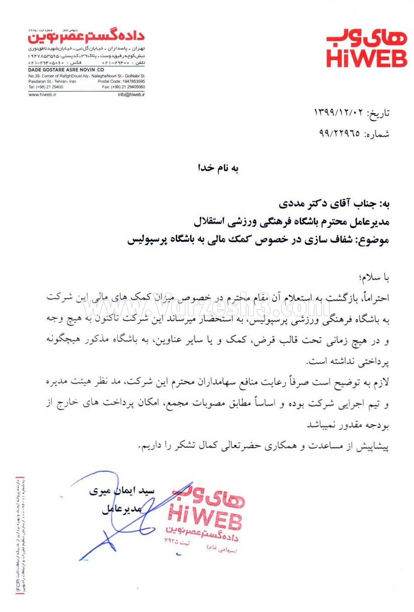 سهیل یحیی زاده مشاور اقتصادی مدیرعامل استقلال در گفتگو با خبرنگار ورزش سه ضمن انتشار این نامه گفت: پیرو شایعه پراکنی عده ای در فضای مجازی علیه کارگزار و اسپانسر باشگاه استقلال، نامه ای را در خدمت شما قرار می دهیم که طی آن نامه کارگزار باشگاه به صورت رسمی اعلام کرده است هیچ گونه پرداختی به باشگاه پرسپولیس نداشته است و واقعیت امر نیز همین است.