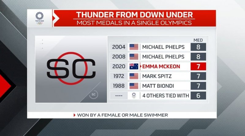 با دو طلای 50 و 100 متر آزاد، اِما بدل به سریعترین شناگر زن المپیک توکیو نیز شده و حالا موجی از توجه را به سوی خود جلب دارد؛ با این وصف تیم ملی استرالیا، بهترین نتیجه تاریخ خود را به دست آورد، کما اینکه تیم بریتانیا هم با کسب 4 طلا و رکورد 8 مدال در مجموع نمایشی فوقالعاده در المپیک داشت و این درخششها باعث شد تا آمریکا تنها به 11 طلا بسنده کند که 5 طلا کمتر از ریو و لندن بود.