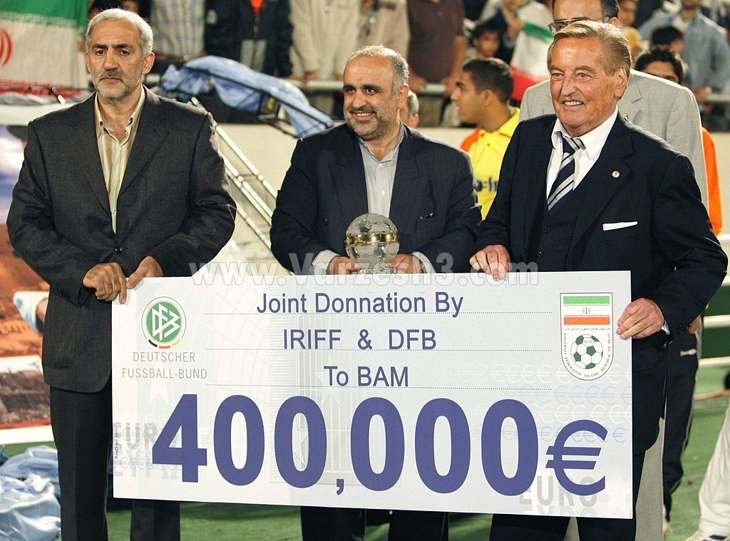 گرهارد مایر ورفلدر، رئیس فدراسیون فوتبال آلمان در کنار محمد دادکان و مهدی دادرس و اختصاص یافتن رقم 400 هزار یورو برای بازسازی مناطق زلزله زده در شهر بم