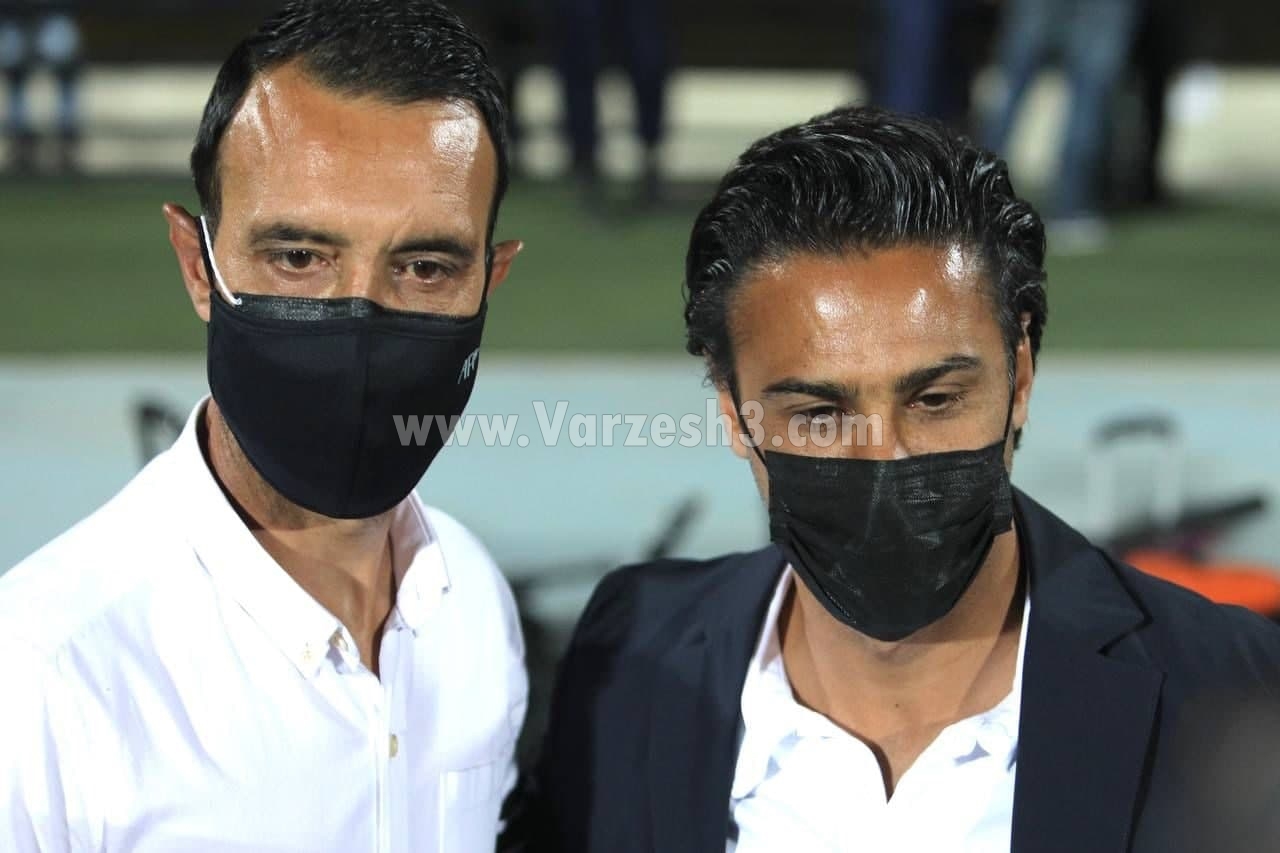 *علیرضا اسدی مدیرعامل و جهانگیر کوثری عضو هیات مدیره باشگاه هوادار به همراه ناصر فریادشیران، تماشاگر این بازی در ورزشگاه آزادی هستند.