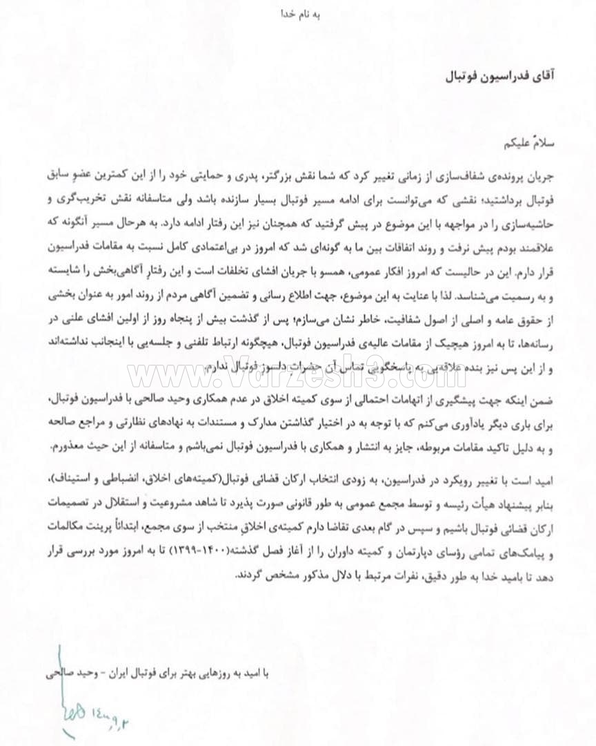 وی تاکید کرده علاقه ای به تماس مسوولان فدراسیون فوتبال ندارد. اما نکته مهم صحبت های صالحی به پاراگراف نامه او برمیگردد: