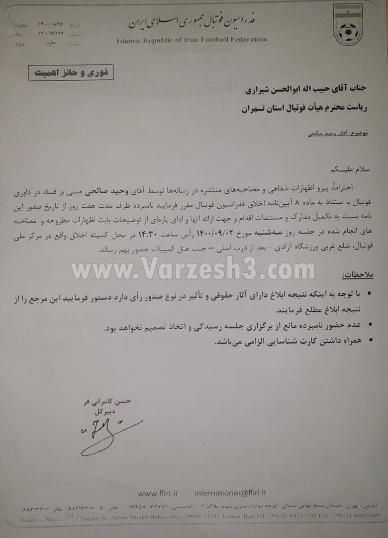 صالحی بنا بر احضاریه کمیته اخلاق امروز باید راس ساعت 16 خود را به محل این کمیته میرساند. در این نامه که به امضای حسن کامرانی فر رسیده اعلام شده حتی در صورت غیبت نامبرده این جلسه برگزار و در آن تصمیم لازم اتخاذ خواهد شد. صالحی در جواب با اعلام کلی "آقای فدراسیون فوتبال" ضمن انتقاد از آنچه که فدراسیون در قبال صحبت های وی انجام داده، این تشکیلات را به تخریب گری و حاشیه سازی متهم کرده است و نوشته است هیچ اعتمادی به مسوولان و مقامات فدراسیون فوتبال ندارد.