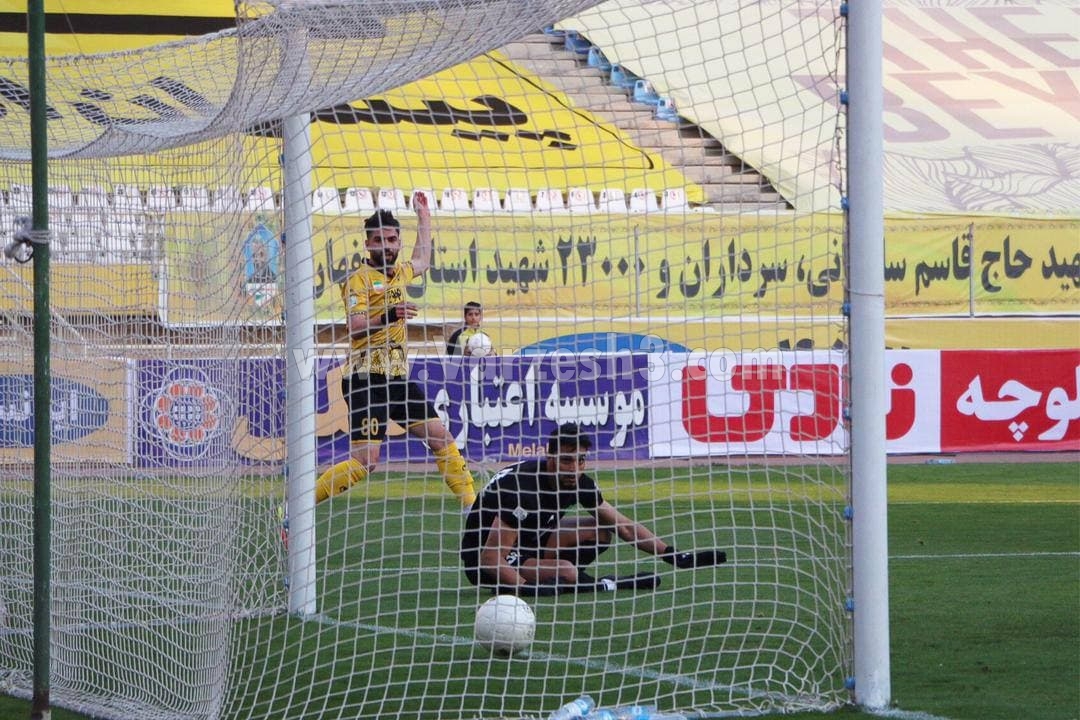 دقیقه 86: شوت سنگین امید نورافکن از روی ضربه آزاد 30 متری را گوهری در حالت درازکش مهار کرد.
